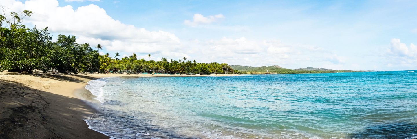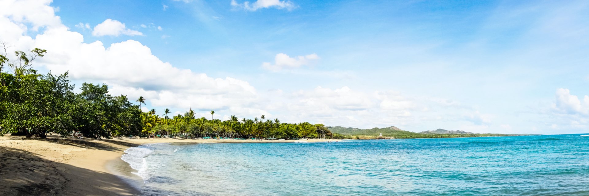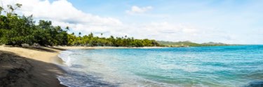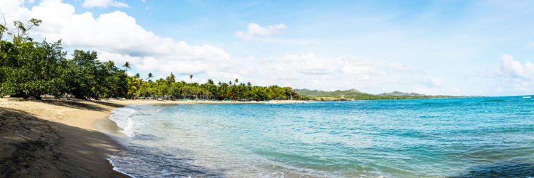 Blue water washes up against the sandy beach, surrounded by trees.