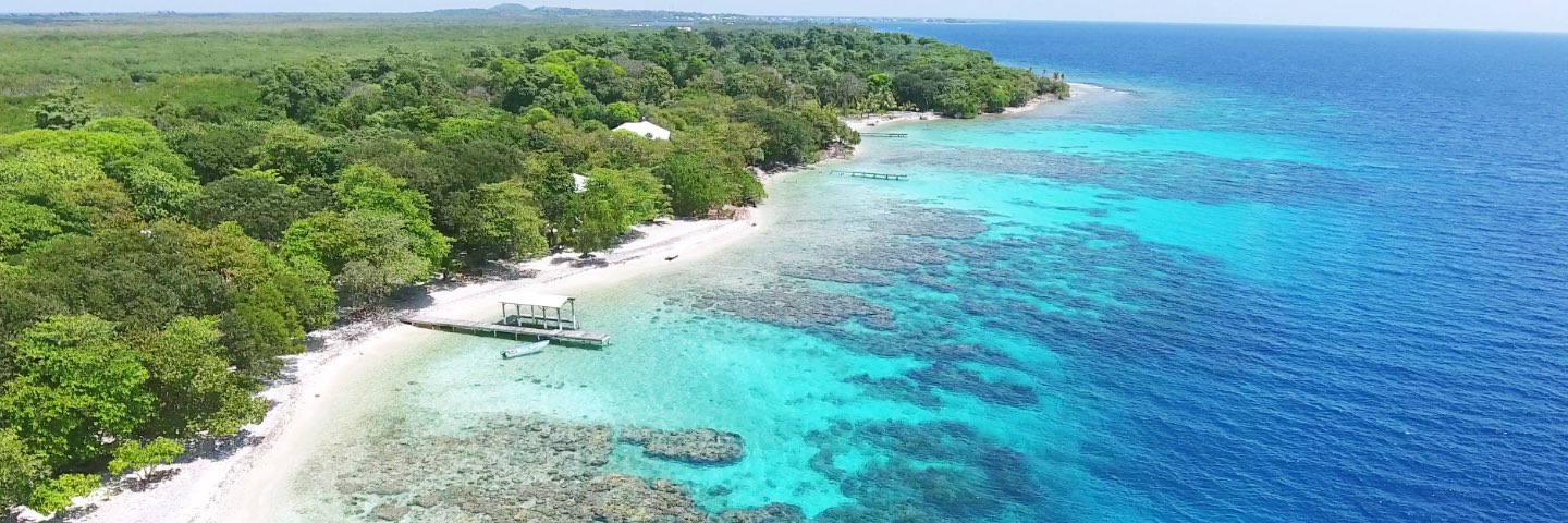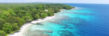 Shades of blue and green swirl in the ocean water washing up against the white sand beach.