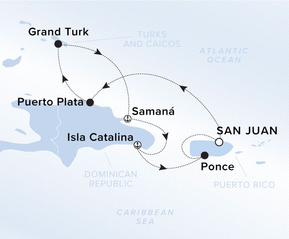 A map of the Atlantic Ocean and Caribbean Sea, showing the yacht's voyage from San Juan around Puerto Rico and the Dominican Republic, to Grand Turk, and back to San Juan.