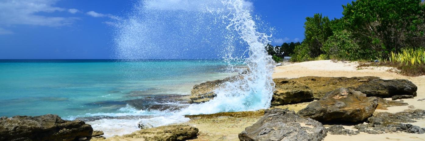 Water splashes as it hits rocks on the sandy beach.