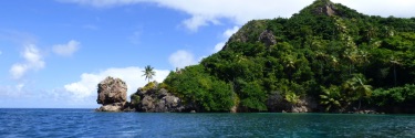 An island covered in lush greenery surrounded by deep blue water.
