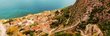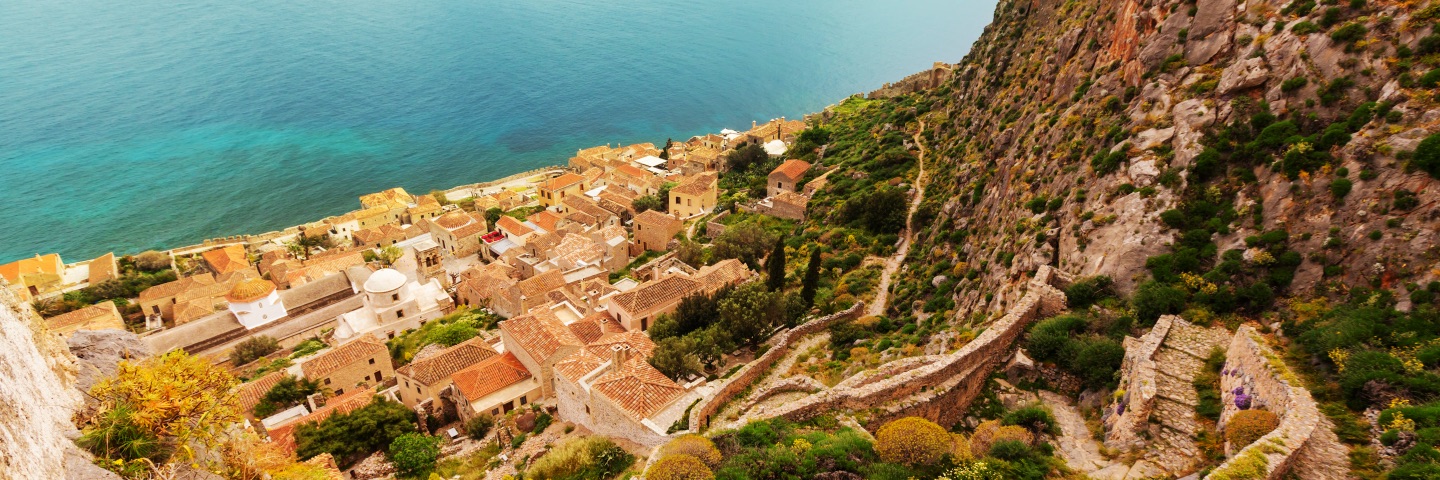 Looking down a seaside cliff over buildings into the blue water.