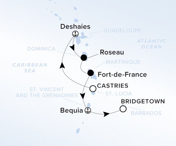 A map of the Atlantic Ocean and Caribbean Sea. A line shows the voyage from Castries to Deshaies, Roseau, Fort-de-France, Bequia and Bridgetown.