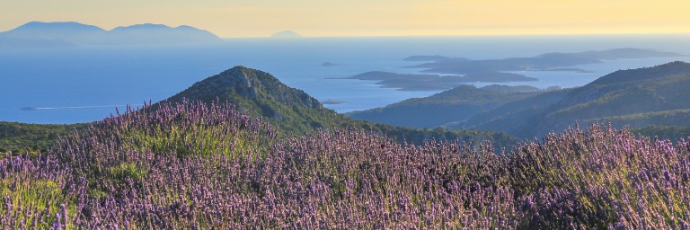 Looking out over lavender fields and rolling hills to see the ocean in the distance.