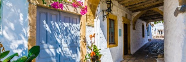 A blue door with pink flowers over it, in front of a small walkway.