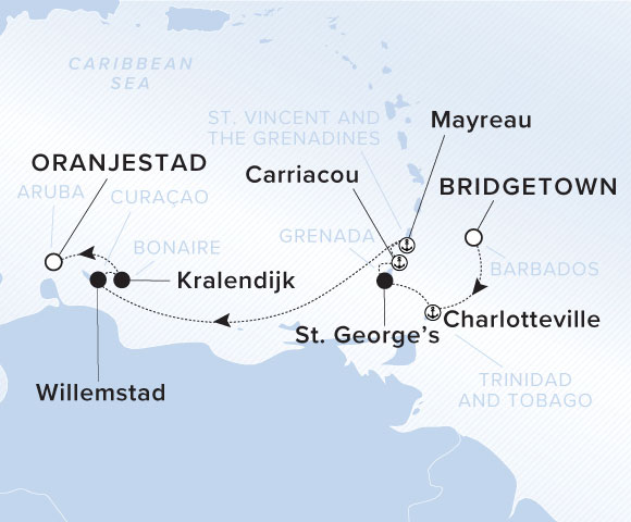 A map plotting the yacht's journey from Bridgetown, Barbados through Charlotteville, St. George's, Carriacou, Mayreau, Willemstad, Kralendijk and concluding in Oranjestad, Aruba.