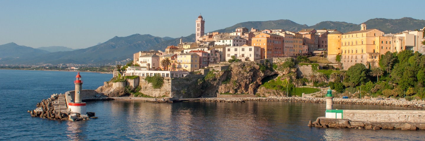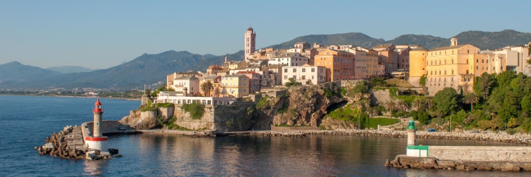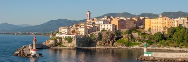 A city on the side of a mountain overlooking the sea.
