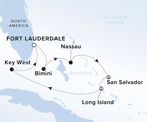 A map of the Caribbean Sea showing the yacht's journey from Fort Lauderale, Florida to Bimini, Nassau, San Salvador, Long Island, Key West and returning to Fort Lauderdale.
