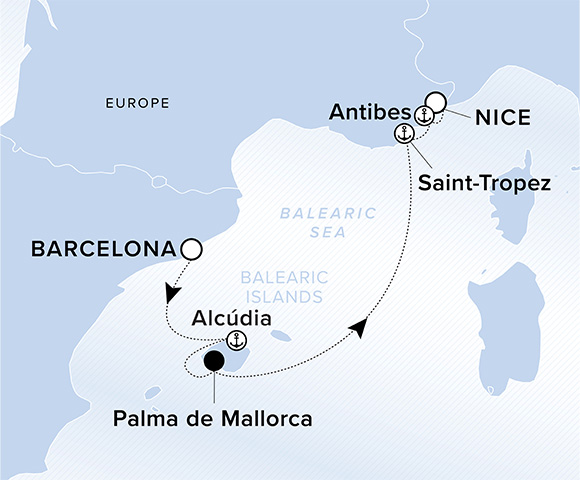 A map of Europe and the Balearic Sea. A line shows the voyage from Barcelona to Alcúdia, Palma de Mallorca, Saint Tropez, Antibes and Nice.