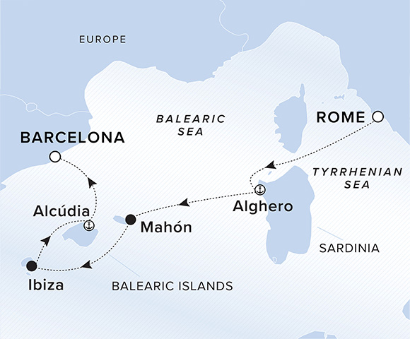 A map showing the Tyrrhenian Sea and Balearic Sea. A line shows the voyage route from Rome to Alghero, Mahón, Ibiza, Alcúdia and Barcelona.