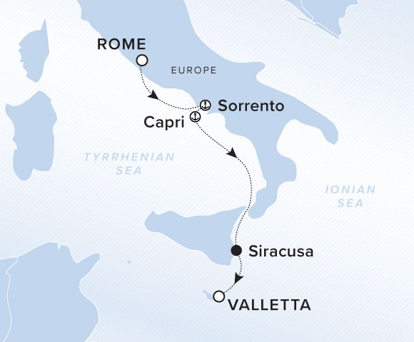 A map of Europe, the Tyrrhenian Sea and Ionian Sea. A line shows the voyage departing from Rome with stops in Sorrento, Capri, Siracusa and Valletta.