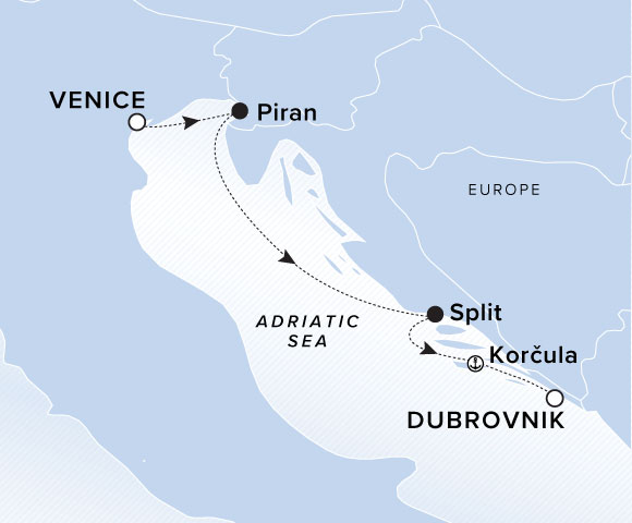 A map of the Adriatic Sea with the yacht's voyage from Venice, Italy to Piran, Split, and Korcula ending in Dubrovnik, Croatia.
