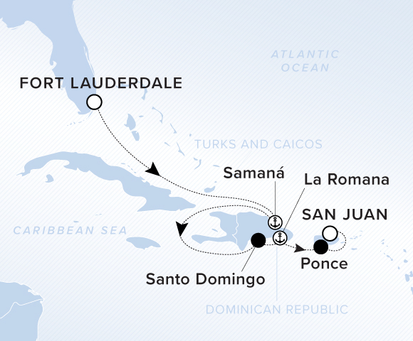 A map showing the Atlantic Ocean and Caribbean Sea. A line shows the voyage from Fort Lauderdale to Samana, Santo Domingo, La Romana, Ponce and San Juan.