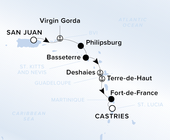A map showing the Atlantic Ocean and Caribbean Sea. A line shows the voyage from San Juan to Virgin Gorda, Philipsburg, Basseterre, Falmouth Harbour, Deshaies, Terre-de-Haut, Fort-de-France, and Castries.