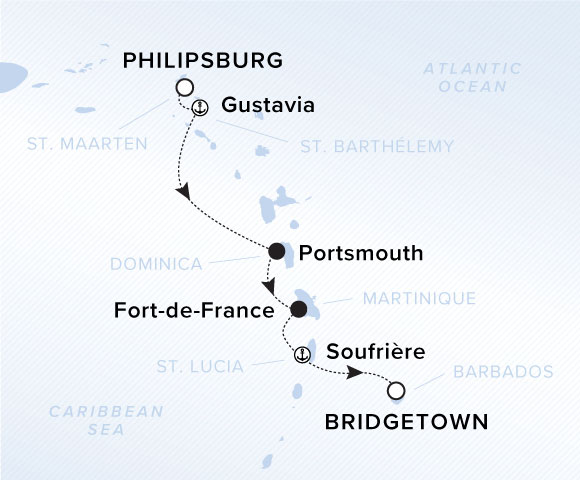 A map of the Caribbean sea showing the yacht's voyage from Philipsburg to Gustavia, Porstmouth, Fort-de-France, Soufriere and Bridgetown.