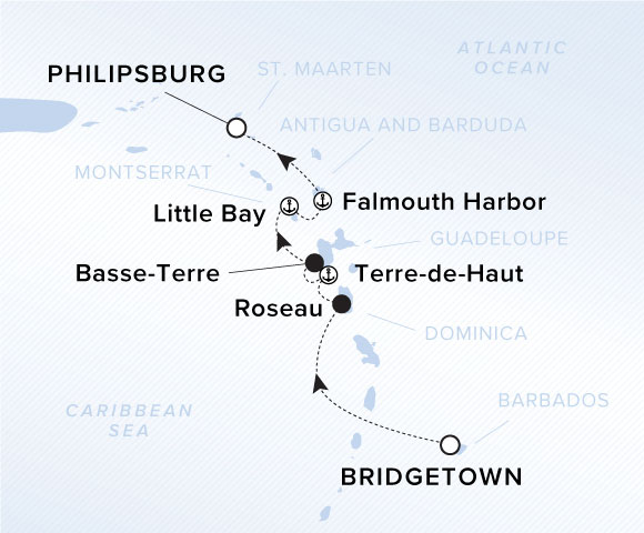 A map of the Caribbean sea noting the yachts voyage from Bridgetown to Roseau to Terre-de-Haut to Basse-Terre to Little Bay to Falmouth Harbor to Philipsburg