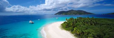 Small boats anchored on turquoise blue water just offshore of a white, sandy beach with a coast of lush green vegetation.