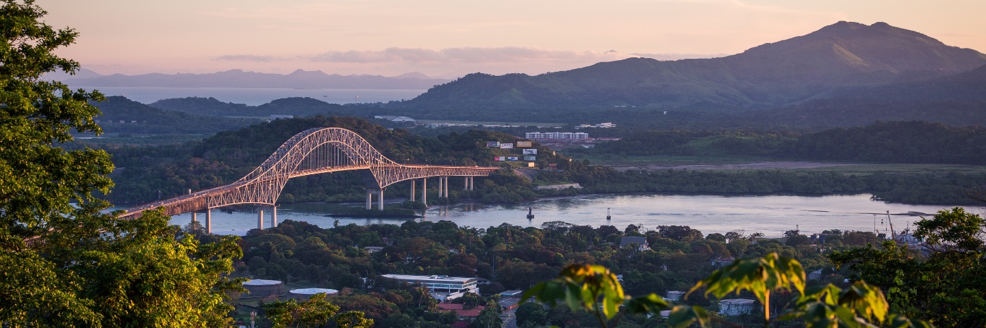 The Bridge of the Americas spans the Pacific entrance to the Panama Canal at dusk.