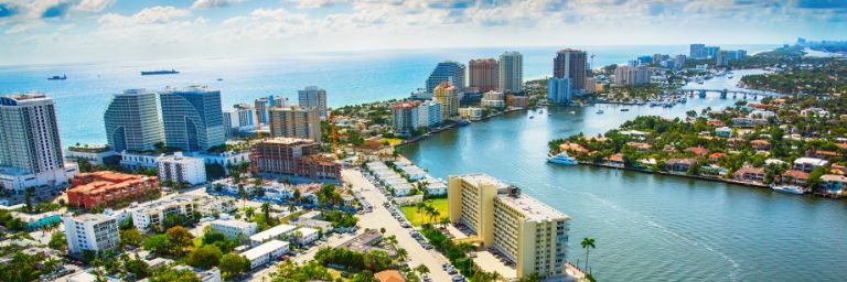 Aerial view of the intercoastal waterway and hotels along the coast of Fort Lauderdale, Florida.