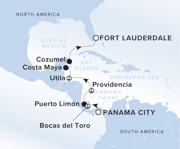 See the engineering wonder that is the Panama Canal firsthand before sailing to Bocas del Toro to relax beneath a palm tree. Surrender to the chilled-out vibe of Honduras’ gorgeous Bay Islands and stumble upon Mayan ruins in Cozumel’s lush forests.