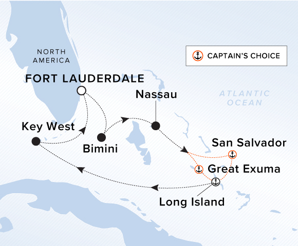 A map of the Caribbean Sea with a line plotting the yacht's journey from Fort Lauderdale to Bimini to Nassau to San Salvador to Long Island to Key West back to Fort Lauderdale.