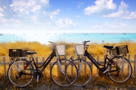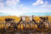 Two bicycles leaning against the fence on a country road overlooking the sea.