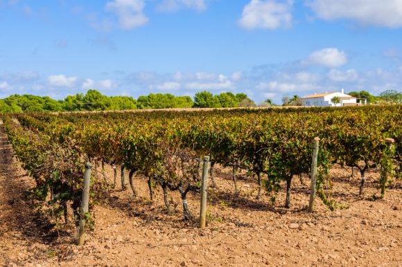A vineyard in Spain under blue skies.