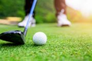 Close-up shot of a golfer's feet, club and ball setting up a shot.