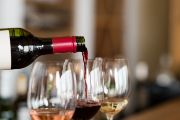 A bottle of red wine being poured into a glass next to glasses of rosé and white wine.