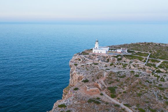 An aerial view of the top of a rocky cliff featuring a whitewashed lighthouse overlooking the blue ocean.
