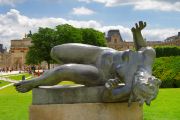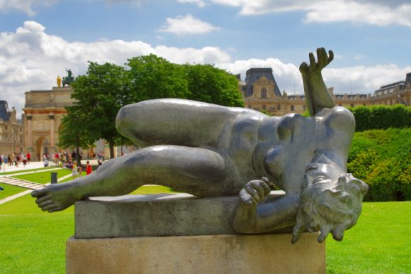 A silver sculpture of a woman lying on her side in a green park with a historical building in the background.
