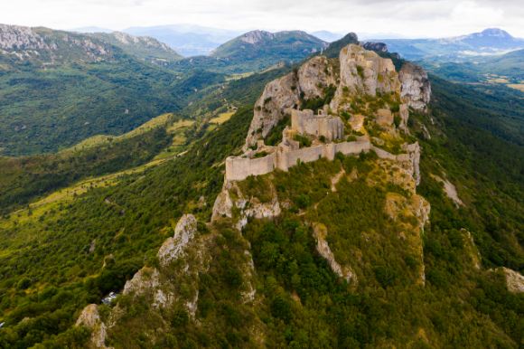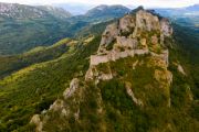 An aerial view of the ruins of Cathar castle of Peyrepertuse perched on a rocky ridge.