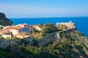 An Italian-style estate sitting on the edge of grassy cliff overlooking the sea.