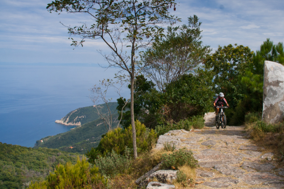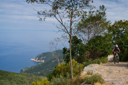 A person mountain biking on a stone path at the top of a mountain with the ocean in the background.