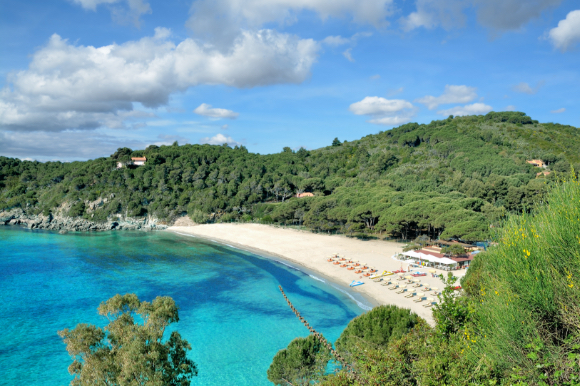 View of a white sand beach with lines of lounge chairs and bright blue water from a lush hillside.