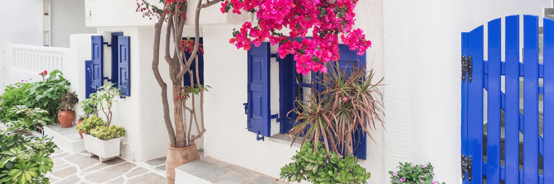Vibrant pink flowers grow along a white building with bright blue shutters.