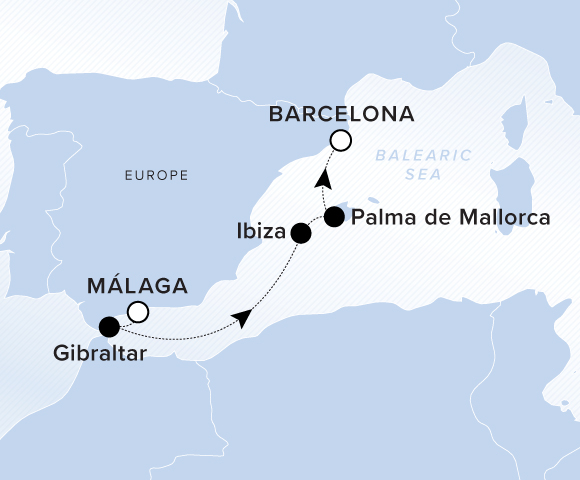 Soak up the sun at the gorgeous gateway to the Costa del Sol, sail past the Rock of Gibraltar, let loose in Ibiza and explore centuries of history in Palma de Mallorca as you make your way toward the architectural wonder of Barcelona.