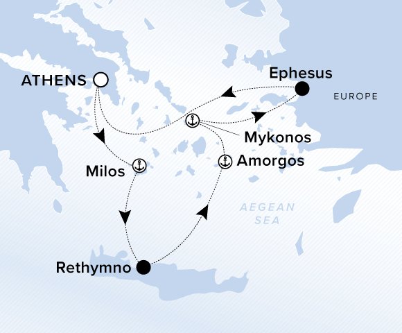 A map of Europe and the Aegean Sea. A line shows the voyage departing from Athens to Milos, Rethymno, Amorgos, Mykonos, Ephesus and returning to Athens.