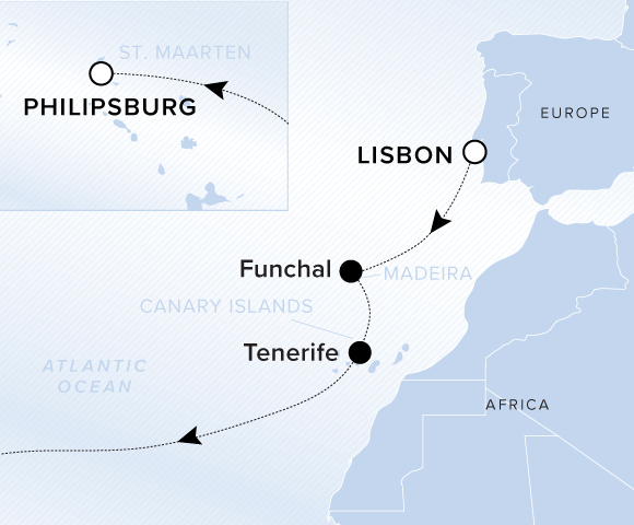 After exploring the volcanic island of Madeira, relax on an overnight stay in majestic Tenerife. Shop and dine on the bustling Calle de la Noria or enjoy one of the many hiking trails in Anaga Rural Park before setting sail to St. Maarten.