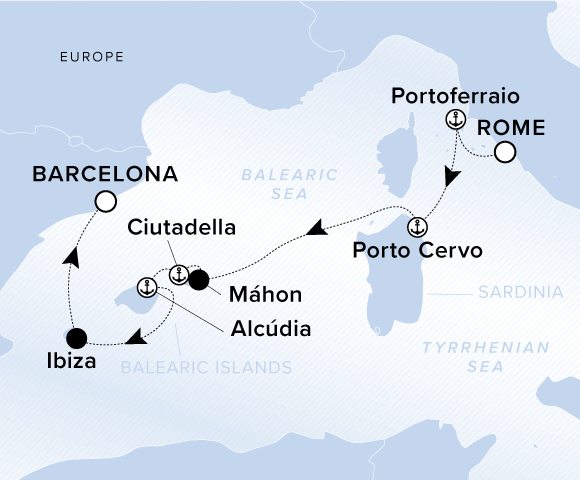 A map of Europe and the Balearic Sea. A line shows the voyage from Rome to Portoferraio, Porto Cervo, Mahon, Ciutadella, Alcudia, Ibiza and Barcelona.
