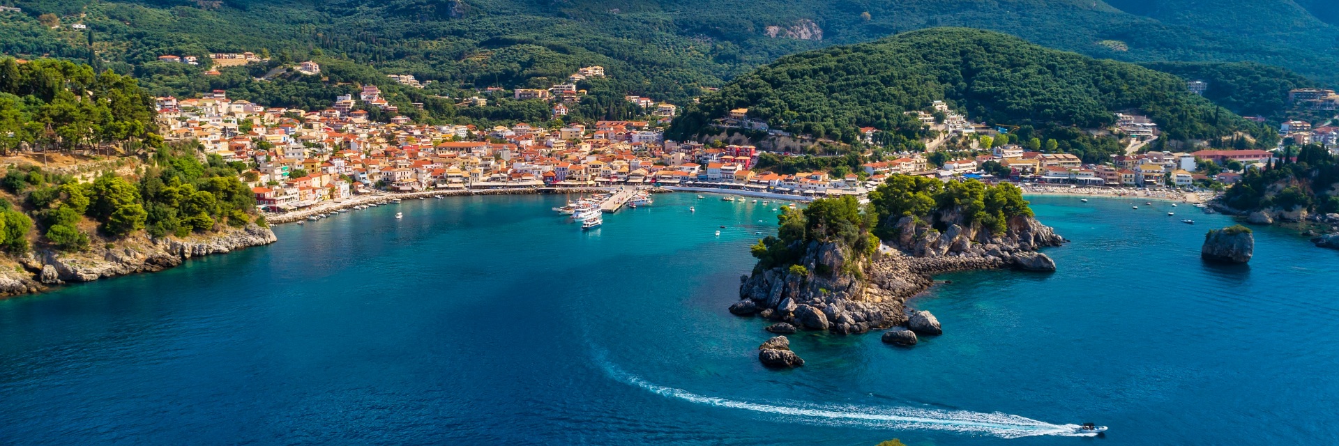 Aerial view of a bright blue bay and Mediterranean-style village along the water.