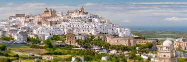 White and tan buildings in a city on a hill with clouds over blue sea behind.