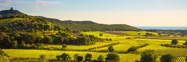 Several green farm fields with hills in the background.