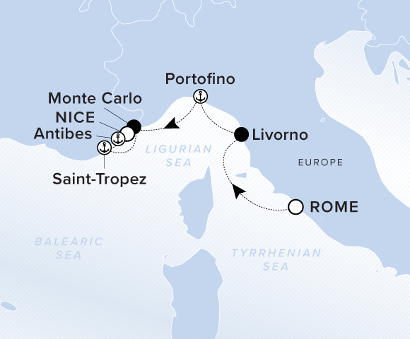 A map showing the Tyrrhenian Sea, Ligurian Sea and Balearic Sea. A line shows the voyage route from Rome to Livorno, Portofino, Monte Carlo, Saint-Tropez, Antibes and Nice.