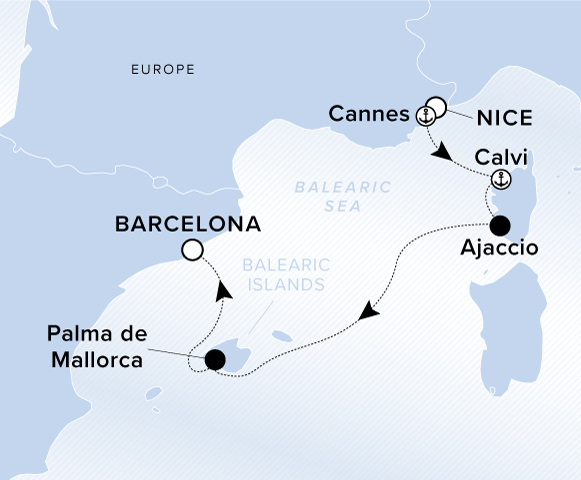 A map showing the Balearic Sea and Europe. A line shows the voyage route from Nice to Cannes, Calvi, Ajaccio, Ciutadella, Palma de Mallorca and Barcelona.