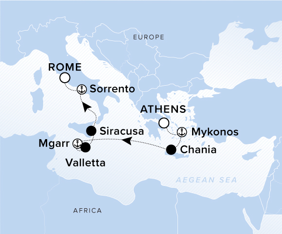 A map showing the Aegean Sea and Europe. A line shows the voyage route from Athens to Mykonos, Chania, Mgarr, Valletta, Siracusa, Sorrento and Rome.