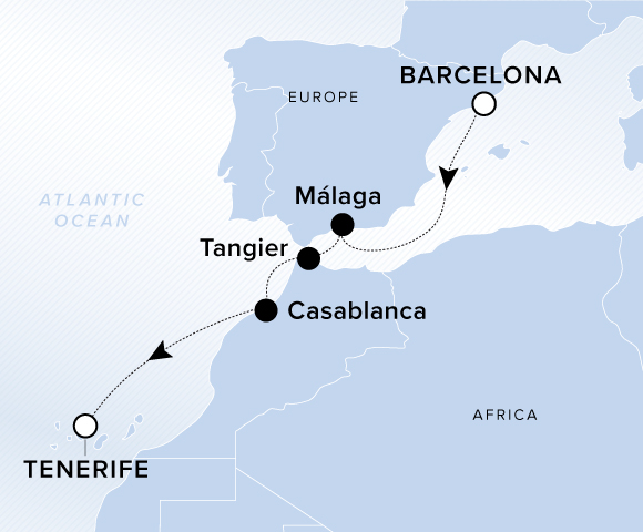 Explore the southern Spanish coast from Barcelona to Málaga before crossing the Strait of Gibraltar to Morocco. With an overnight in Casablanca, visit the ornate Hassan II Mosque overlooking the coastline or set out on a day trip to the vibrant markets of Marrakech, before setting sail to the Canary Islands.