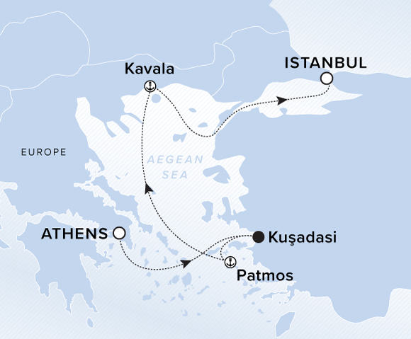 A map showing the Aegean Sea. A line shows the voyage route from Athens to Patmos, Ephesus, Kavala and Istanbul.