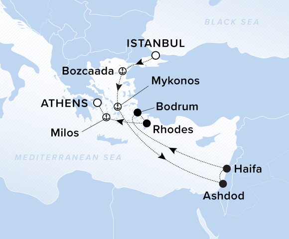 A map showing the Aegean Sea. A line shows the voyage route from Istanbul to Bozcaada, Mykonos, Ashdod, Haifa, Rhodes, Milos and Athens.