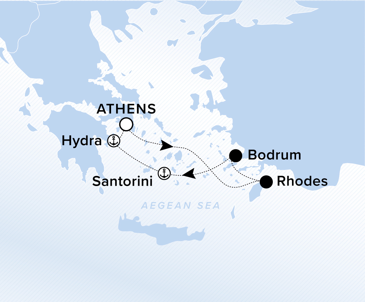 A map showing the Aegean Sea. A line shows the voyage route from Athens to Rhodes, Bodrum, Santorini, Hydra and Athens.